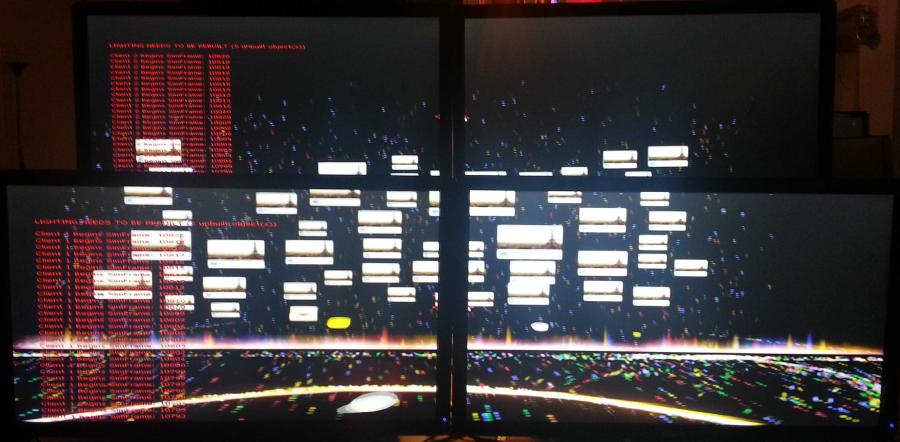 I was the lead engineer on the project. Our goal was essentially to use Unreal to drive a large multi monitor view of a single shared scene. Each monitor was to show only its part of the scene so as to create the effect of a single large monitor. For instance, you might create a large “meta” monitor out of nine actual monitors arranged in a 3x3 grid. The end effect is something you’ve likely seen before on wall-sized displays, scoreboards, and other things. The banner image at the very top of this post shows how our early stage prototype looked on a 2x2 setup. Skip to the bottom, if you want to see a short video of the demo in action.